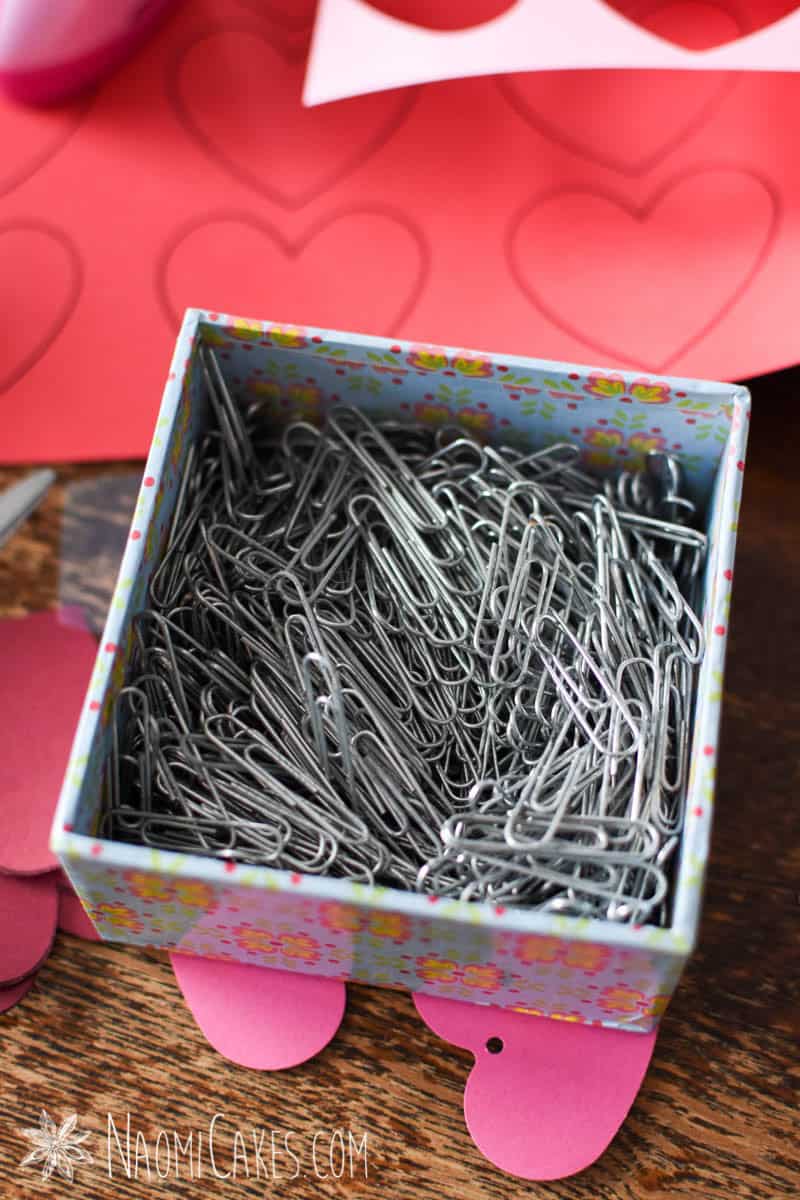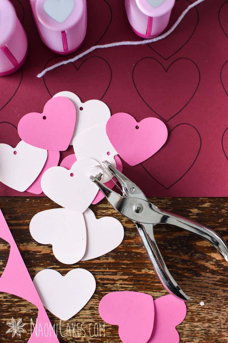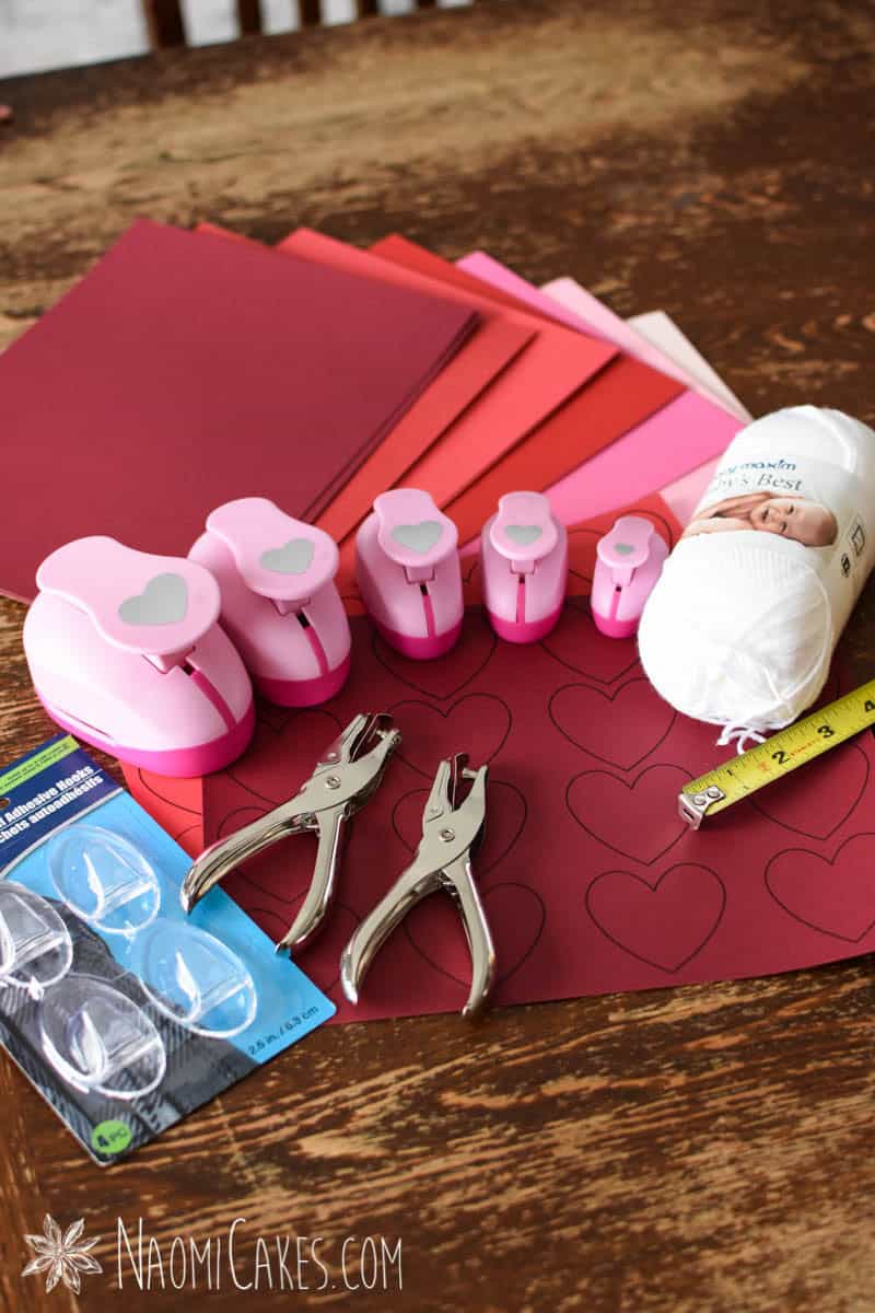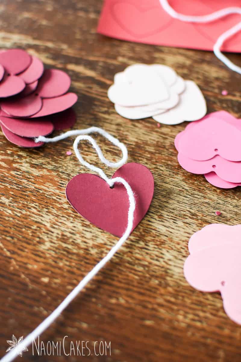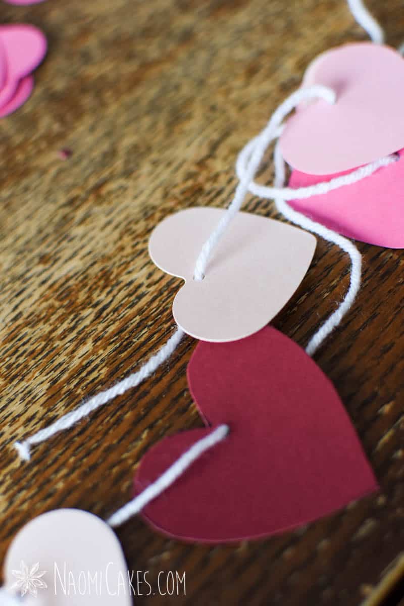 You can tie the hearts on instead of clipping them, but this process will take much longer that way! To do this, use a hole punch to thread the hearts onto the yarn (as I did for many of my hearts in these pictures), and tie them into place at your desired intervals.