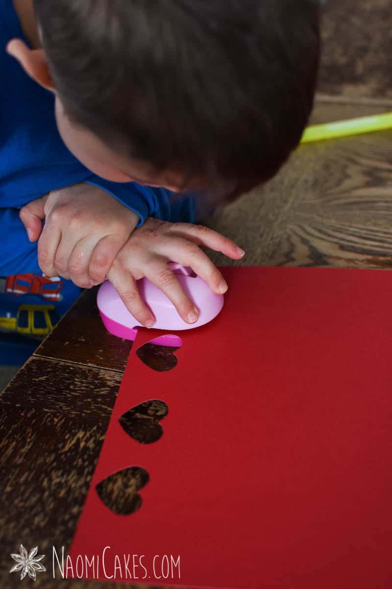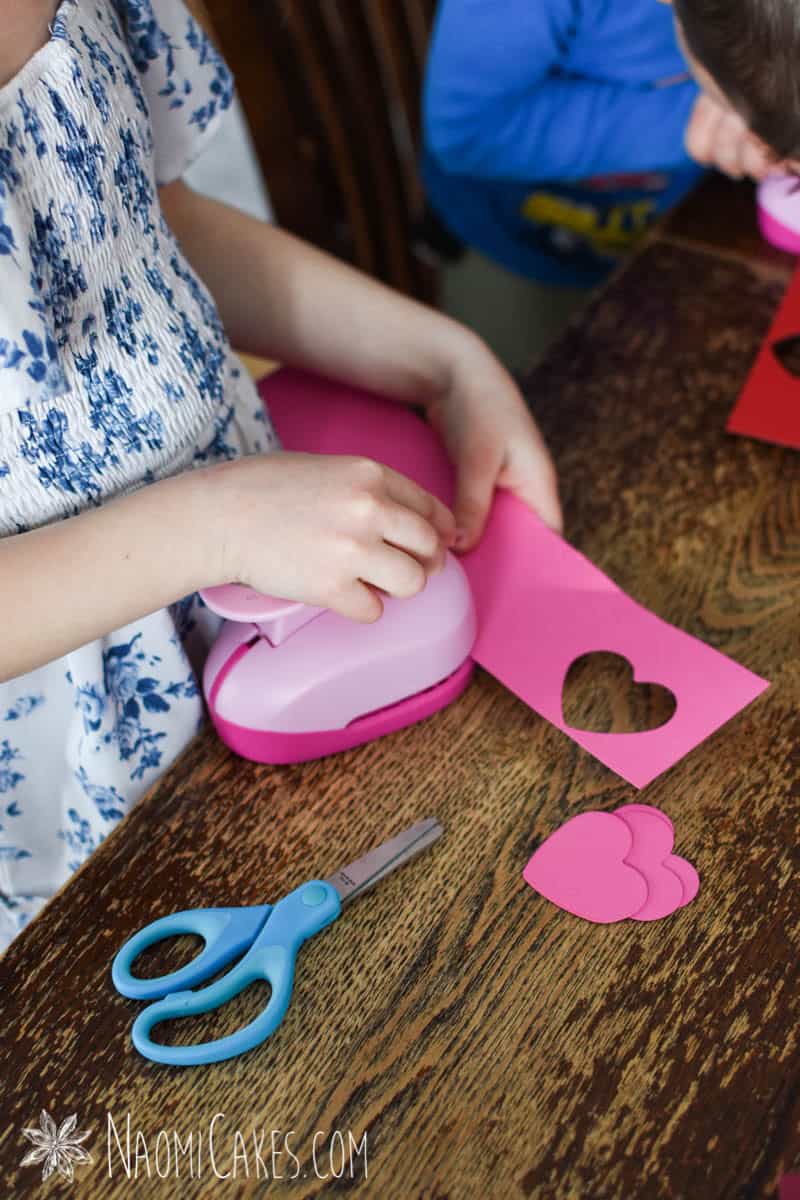 To make this process a little bit less messy and more streamlined, I do recommend having at least one stamp, pair or scissors, or something for each kid involved to do. Unless they’re much older, you will have to do the hanging of these hearts on your own. That will mean that the main task available for kids to help with is the cutting.
