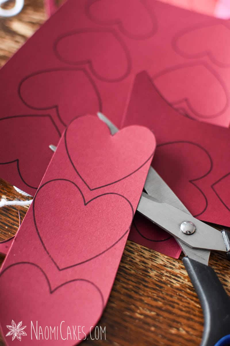 To make the hearts for your garland, you can use heart shaped stamp cutters, or go ahead and use my free printable template. I used about 32 2-inch hearts to string across a 6-ft glass door, or about 13 small and larger hearts to string across a 4-ft window. Cut out a bunch of hearts, and set them aside.